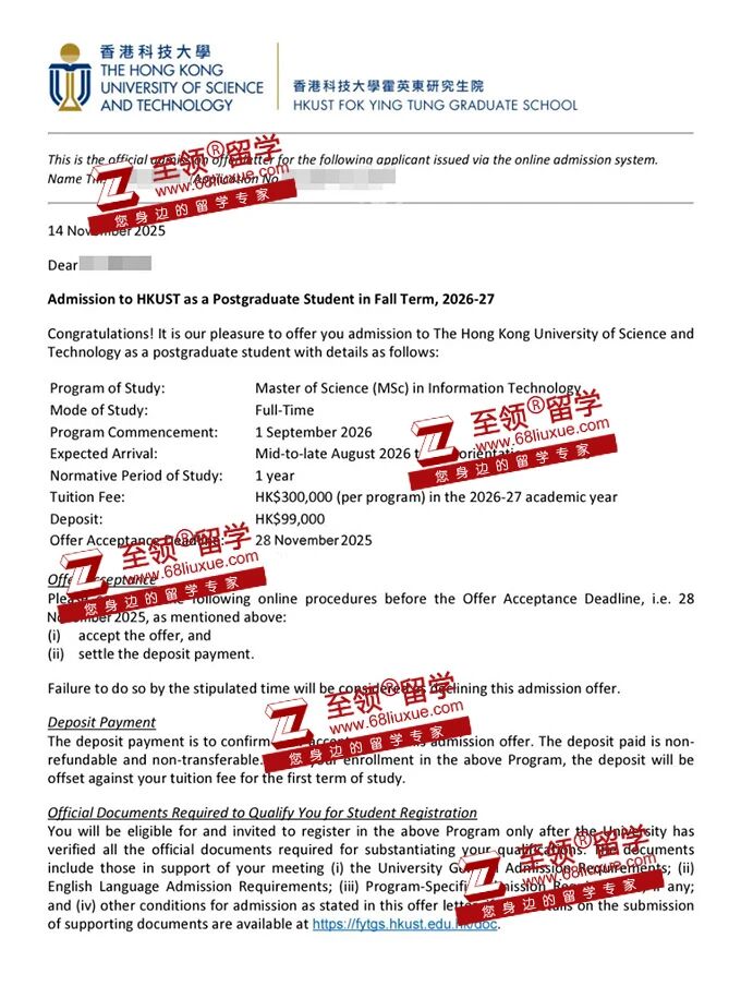录取结果:香港科技大学(HKUST) MSc in IT硕士录取