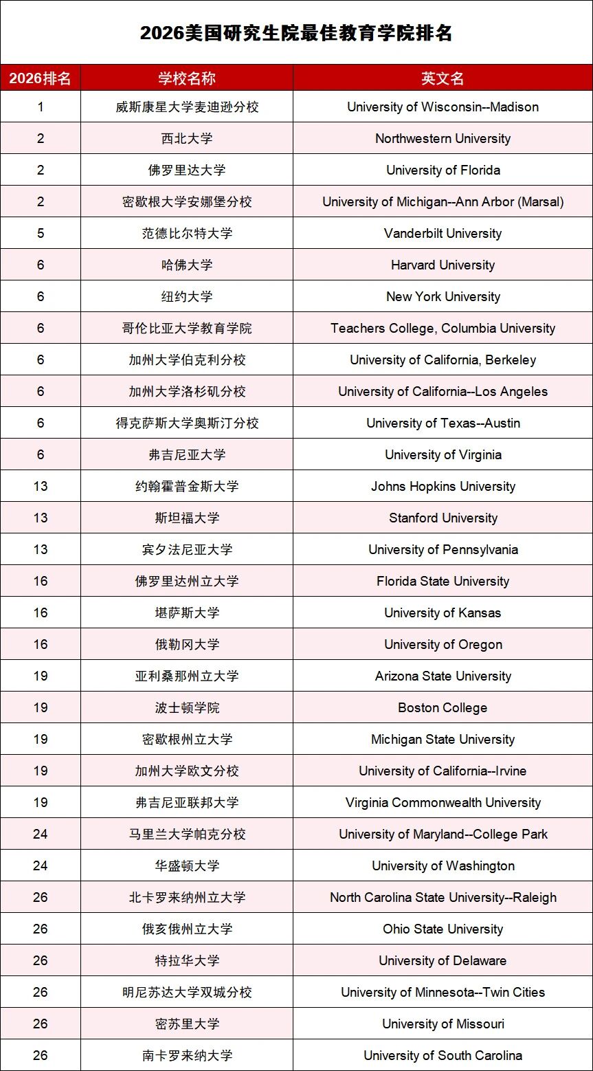 4月7日,U.S.News & World Report 发布了 2026 全美最佳研究生院校排名! 本文为大家盘点美国2026USNEWS最佳研究生教育学院排名。